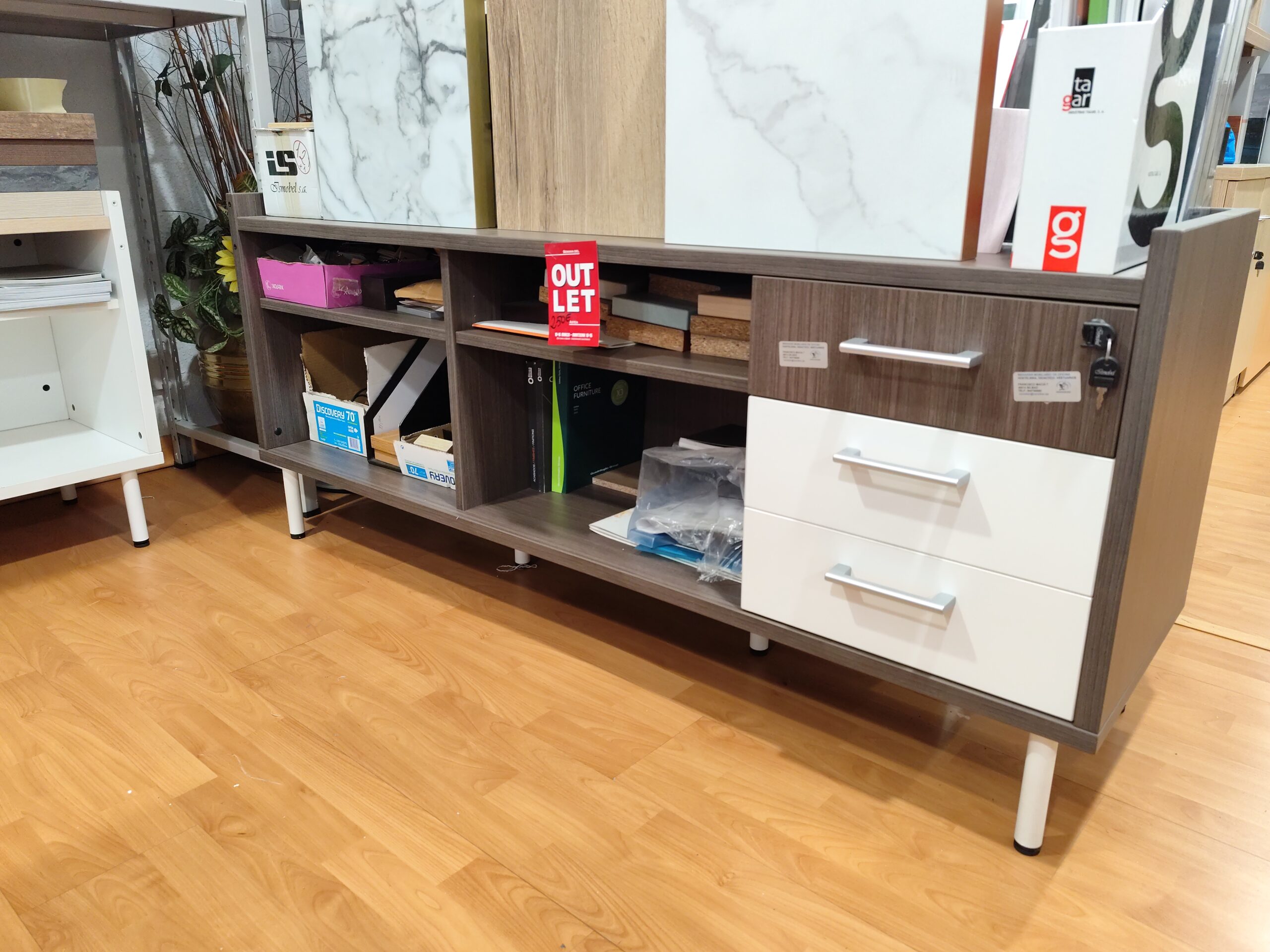 Mueble bajo, de 165x45x71h, en color roble y blanco, con 3 cajones con cerradura, puede hacer función de ala en cualquier mesa.
